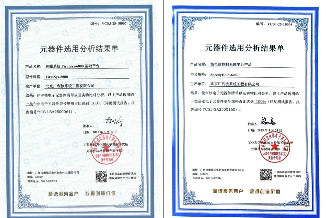 廣利核公司自主可控安全級和非安全級DCS產(chǎn)品通過電子五所全國產(chǎn)化認證持